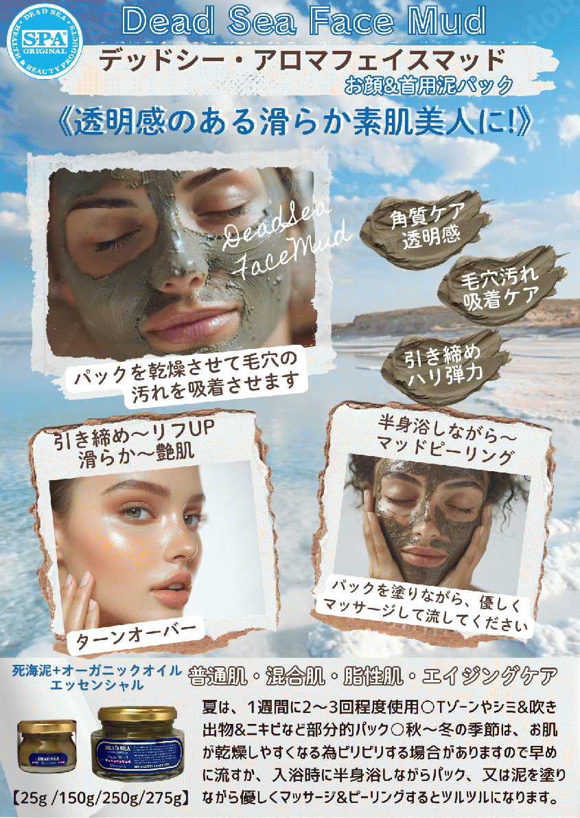 【Dead Sea Spa デッドシー・スパ】死海商品 すべて 【死海の入浴塩】デッドシー・バスソルト・入浴剤 【死海の入浴塩(アロマ)】デッドシー・アロマバスソルト・アロマエッセンスバスソルト 【死海のユーカリバスミルク】デッドシー・ユーカリバスミルク 【死海の食用塩】デッドシー・エディブルソルト 【飲む死海ミネラル】セレミネラル 【純粋・死海深層水】デッドシー・ジェニュインウォーター・ブレンドウォーター 【死海の泥】お顔・頭・全身・脚のマッドパック 【死海の石鹸】ミネラル・マッド・シュルパー・ハーブ 【死海スクラブ】リラクシング・リフレッシング・エナージング・クリーニング 【死海のフェイスケア】マッドパック・スクラブ CCクレイフェイシャルマスク 【死海のボディケア】デッドシー・ブレンドウォーター 【死海のヘアケア】デリフェソープ・シャンプー・コンディショナー 【死海のヘッドケア】スキャルプローション・ヘッドスパマッド 【世界水準ISO認証】ブルージュシリーズ 【死海のマタニティ&産後ケア】バスソルト・ブレンドウォーター・ソープ・マッド他 【死海のベビーケア】バスソルト・ソープ他 【死海のアトピカルケア】バスソルト・ソープ・クリーム他 【死海のスパリゾート・パッケージ】スクエアシリーズ(健康応援価格20%OFF) 【死海のギフトセット】 【死海のお試しセット】 【DELIfe デリフェ】デッドシー・アロマソープ《顔・髪・身体》 【ZEN GARDEN ゼンガーデン】オイル・エッセンシャル 【ZEN GARDEN ゼンガーデン】認証ハーブティー 【Teeccino ティーチーノ】ハーバルコーヒー(コーヒー豆不使用・ノンカフェイン) 【Holy Land Cosmetics ホリーランドコスメ】ハーバル化粧品 【Herbal Supplement ハーバルサプリメント】ナチュラルサプリメント 【Bee アピ】ハチミツ・プロポリス 【Candle/Fragrance キャンドル/フレグランス】キャンドル・ディフューザー・ランプ 【Gift ギフト】 【Campaign キャンペーン】 【Dead Sea Spa デッドシー・スパ】死海商品 | 【死海のフェイスケア】マッドパック・スクラブ 21 products are found! 21件の商品がございます。 価格順 新着順 表示件数 50件 100件 デッドシー・フェイスアロママッド25g 【グリーンマーク取得】【普通肌・脂性肌・混合肌・エイジングケア】死海泥の天然ミネラル成分が古い角質や毛穴の汚れを落とし、お肌にハリを与え滑らかにする『天然100%泥パック+オーガニック植物オイル+エッセンシャルオイル』がブレンドされた良質な『お顔&首&デコルテ用の泥パック』です。男性、思春期のお子様にもおすすめです。 デッドシー・フェイスアロママッド150g 【グリーンマーク取得】【普通肌・脂性肌・混合肌・エイジングケア】死海泥の天然ミネラル成分が古い角質や毛穴の汚れを落とし、お肌にハリを与え滑らかにする『天然100%泥パック+オーガニック植物オイル+エッセンシャルオイル』がブレンドされた良質な『お顔&首&デコルテ用の泥パック』です。男性、思春期のお子様にもおすすめです。 デッドシー・フェイスアロママッド250g 【グリーンマーク取得】【普通肌・脂性肌・混合肌・エイジングケア】死海泥の天然ミネラル成分が古い角質や毛穴の汚れを落とし、お肌にハリを与え滑らかにする『天然100%泥パック+オーガニック植物オイル+エッセンシャルオイル』がブレンドされた良質な『お顔&首&デコルテ用の泥パック』です。男性、思春期のお子様にもおすすめです。 デッドシー・フェイスアロママッド 275g 【グリーンマーク取得】【普通肌・脂性肌・混合肌・エイジングケア】死海泥の天然ミネラル成分が古い角質や毛穴の汚れを落とし、お肌にハリを与え滑らかにする『天然100%泥パック+オーガニック植物オイル+エッセンシャルオイル』がブレンドされた良質な『お顔&首&デコルテ用の泥パック』です。男性、思春期のお子様にもおすすめです。 デッドシー・フェイスマッド 25ml 【乾燥肌・普通肌用】 身体にも環境にも優しい【グリーンマーク取得】乾燥するお肌にハリ、ツヤ潤いを与える天然100%のお顔用保湿泥パック。やわらかで滑らかな透明感のあるお肌にします。《死海泥の天然ミネラル成分とオリーブオイル&天然保湿成分の植物エキス配合》 デッドシー・フェイスマッド 150ml 【乾燥肌・普通肌用】 身体にも環境にも優しい【グリーンマーク取得】乾燥するお肌にハリ、ツヤ潤いを与える天然100%のお顔用保湿泥パック。やわらかで滑らかな透明感のあるお肌にします。《死海泥の天然ミネラル成分とオリーブオイル&天然保湿成分の植物エキス配合》 健康応援価格20%OFF【SPA SQUARE】デッドシー・フェイス マッド 40g 健康応援価格20%OFF1,200円⇒960円(税別)『死海よりきれいと元気の贈り物』 【赤いラベルのスパ・リゾートパッケージ】死海泥の天然ミネラル成分が古い角質を落とし毛穴を目立たなくしてお肌にハリを与え滑らかにする天然100%のお顔用泥パック【エイジングケア・普通肌・混合肌・脂性肌用】 健康応援価格20%OFF【SPA 